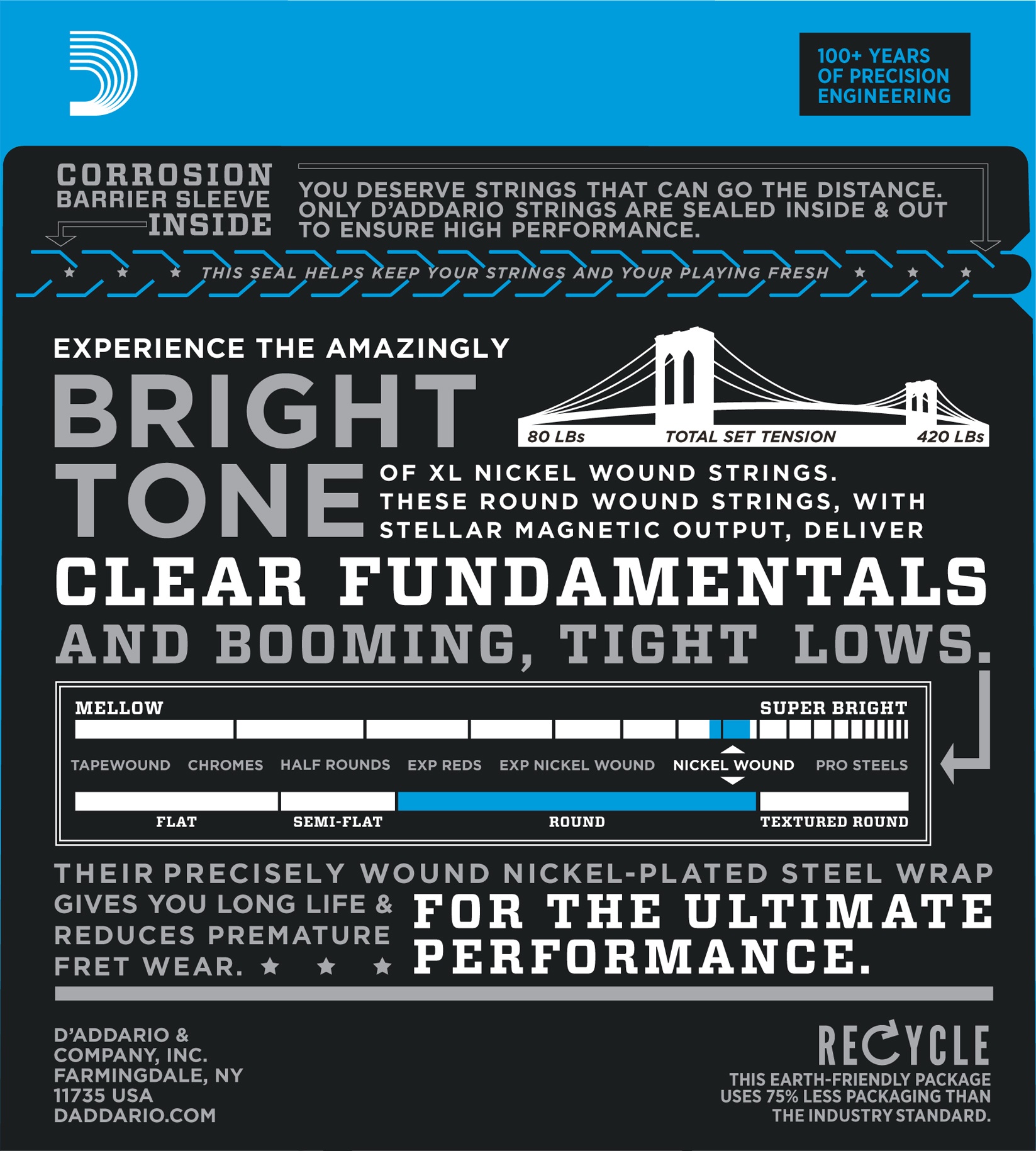 EXL160, D’Addario’s top-selling heavy bass string set, provides the ideal combination of strong overall fundamentals with distinctive brightness and booming, tight lows. Fits basses with a string scale length of up to 36 1/4 inches and a good choice for players looking to down tune. D'Addario XL Nickel Wound Electric Bass strings are world-renowned as "The Player's Choice" amongst bass players of all genres and styles. All XL strings are precision wound on our exclusive digitally-controlled machines, ensuring each string has excellent intonation, clear fundamentals, and unparalleled consistency. Each string is wound with a nickelplated steel wrap wire known for distinctive bright tone with excellent magnetic output delivering a universally appealing and versatile tone for all playing styles. D'Addario's top-selling heavy gauge bass set Round wound with nickelplated steel for a distinctive bright tone with clear fundamentals and booming, tight low end Fits long scale basses with a string scale length of up to 36 1/4 inches Made in the U.S.A. for the highest quality and performance String Gauges: Wound .050, .070, .085, .105 Environmentally friendly, corrosion resistant packaging for strings that are always fresh