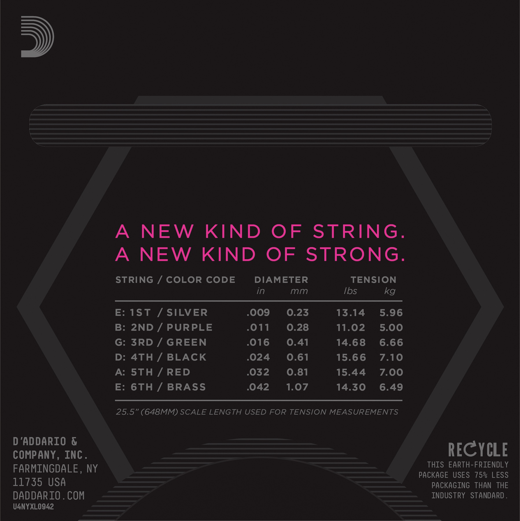 NYXL0942 sets are designed with super light gauges for maximum flexibility. D’Addario NYXL guitar strings will bend farther, sing louder, and stay in tune better than any string you’ve played before. Envisioned, perfected, and manufactured by D’Addario in New York, this newly engineered, break-resistant, high-carbon steel core and plain steel alloy delivers a whole new level of freedom, confidence, and power. NYXL’s provide more strength and up to 131% greater tuning stability by utilizing a completely reinvented wire drawing process coupled with a revolutionary “fusion twist” process for the plain steels. The reformulated nickel plated string windings have greater magnetic properties resulting in higher output and enhanced mid-range frequency response for more presence and crunch. NYXL's feature D’Addario’s exclusive New York manufactured, high carbon steel alloy for unprecedented strength – play fearlessly Improved tuning stability compared to traditional nickel wound strings - get in tune faster, stay in tune better Wound strings with enhanced mid-range frequency response in the 1 - 3.5 kHz range – more presence and crunch to cut through the mix NYXL0942 are designed with super light gauges for maximum flexibility: Plain Steel .009, .011, .016, Nickel Wound .024, .032, .042 Environmentally friendly, corrosion resistant packaging for strings that are always fresh