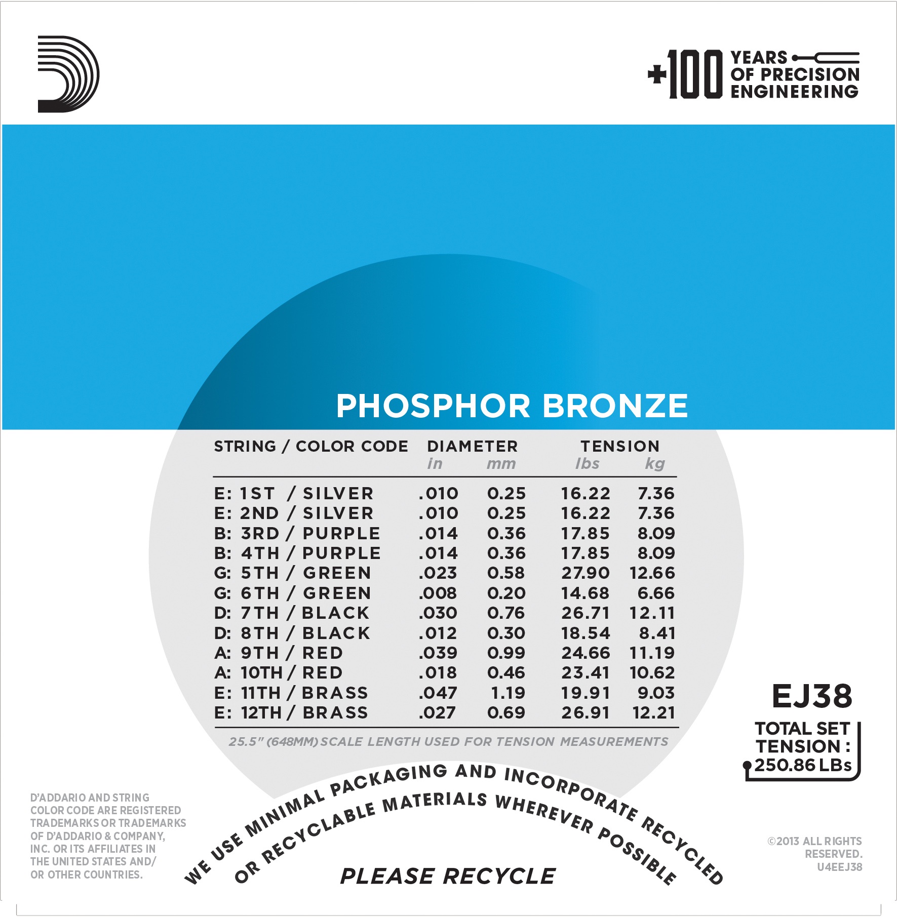 EJ38, D'Addario's most popular 12-string set, offers the ideal balance of volume, projection and comfortable playability. Designed for all makes and models of 12-string acoustic guitars. Phosphor Bronze was introduced to string making by D'Addario in 1974 and has become synonymous with warm, bright, and well balanced acoustic tone. D'Addario Phosphor Bronze strings are precision wound with corrosion resistant phosphor bronze onto a carefully drawn, hexagonally shaped, high carbon steel core. The result is long lasting, bright sounding tone with excellent intonation. D'Addario's most popular 12-string acoustic set with optimized gauges for balanced tone and comfortable playability Preferred for its warm, bright, and well balanced acoustic tone Environmentally friendly, corrosion resistant packaging for strings that are always fresh Made in the U.S.A. for the highest quality and performance String Gauges: Plain Steel .010/.10, .014/.014, Phosphor Bronze Wound .023/.008(p), .030/.012(p), .039/.018(p), .047/.027(w)