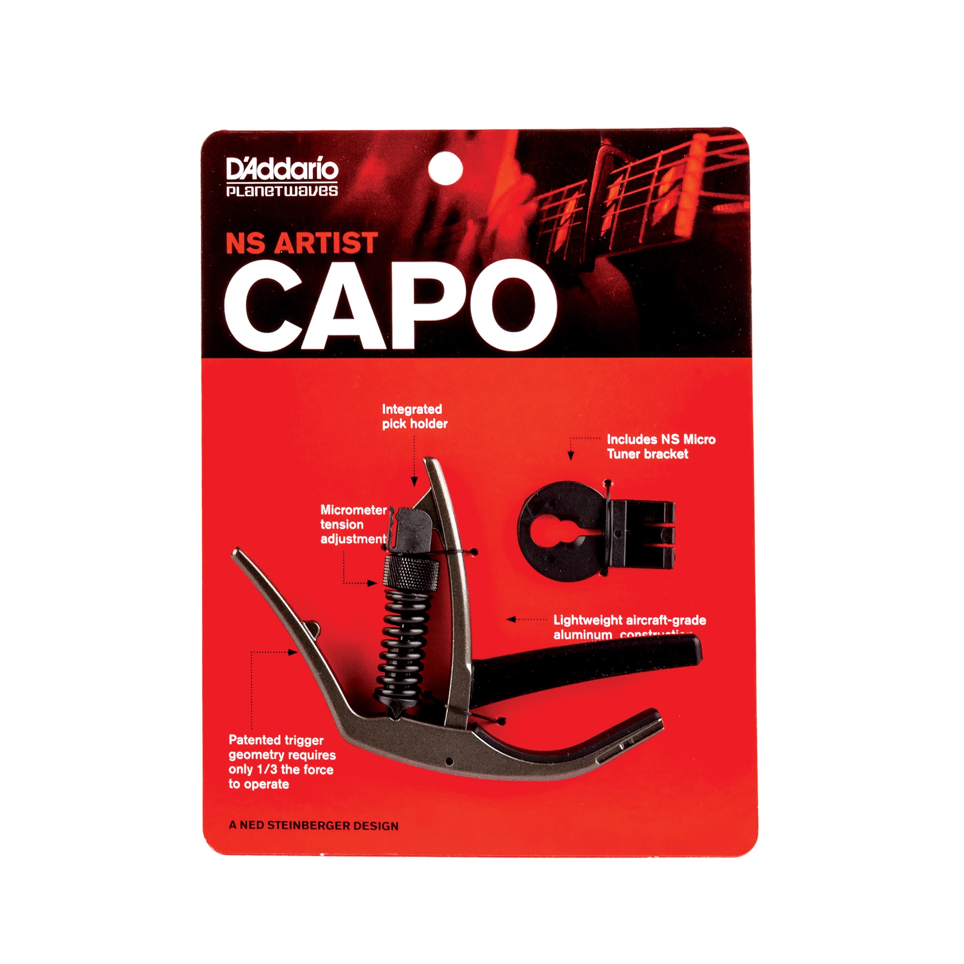 The NS Artist Capo utilizes a patented tri-action geometry reducing the force required to open and close the capo while applying even tension regardless of neck profile. Combined with the micrometer tension adjustment and direct horizontal pressure, the NS Artist Capo virtually eliminates pulling the strings side to side and the need to retune during use. Additionally, the trigger-style design and lightweight aluminum construction adds no obstruction or noticeable weight to the neck of the instrument. The NS Artist Capo includes an NS Micro Tuner mounting bracket, allowing you to add tuning capabilities to the capo. Tuner sold separately. Available in a variety of colors. Designed for use on 6-string electric and acoustic guitars Micrometer tension adjustment assures buzz-free in-tune performance at every fret Patented Tri-Action geometry offers easy use and even clamping tension Lightweight aircraft-grade aluminum construction Includes NS Micro Tuner mounting bracket Available in Black, Metallic Bronze, and Silver D'Addario Accessories promise to be the most innovative professional musician’s tools available. Our diverse capo line is no exception. Many of our groundbreaking models are the result of a productive joint effort between famed designer Ned Steinberger and Jim D’Addario. No matter what style of capo you prefer, D'Addario has the capo for you.