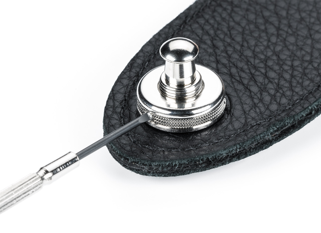 New and unique solid one-piece strap button in hardened steel with self-tapping wood thread. Simply screw it on with an Allen key (size 3mm/ 1/8").