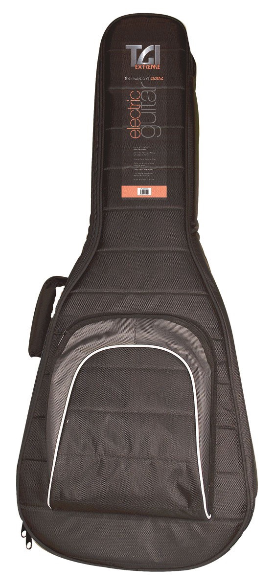 The TGI Extreme series gigbags are made from black woven nylon with contrasting piping featuring 20 mm double heavy padding / 70 denier "no-scratching" lining and strong and comfy carry handles. Also features a music/accessory pocket. Length: 106.5cm, Lower Bout: 37cm, Upper Bout: 33.5cm, Depth: 8cm.