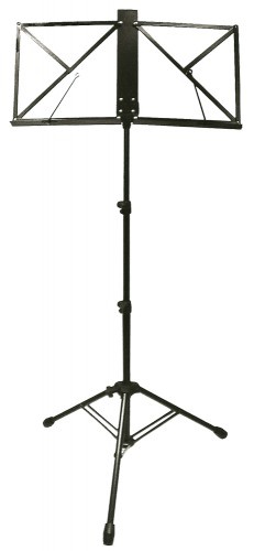Student Music Stand in black. Fully retractable design. Extendable score arms. Fully height adjustable Height: from 450 to 1100mm • Steel construction • Foldable Music desk • Desk dimensions: 400 x 290mm • Folded size: 440 mm • 3-piece folding design • 1.2 kg